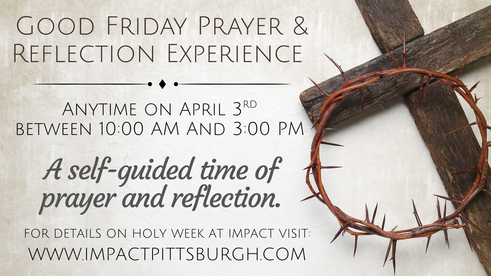 From 10:00 AM –3:00 PM, the Impact auditorium will be open for you to come at any time and move through a series of interactive prayer stations at your own pace. Each station walks through a moment from Good Friday with Scripture, reflection, and a simple response to help you slow down, pray, and remember the sacrifice of Jesus.